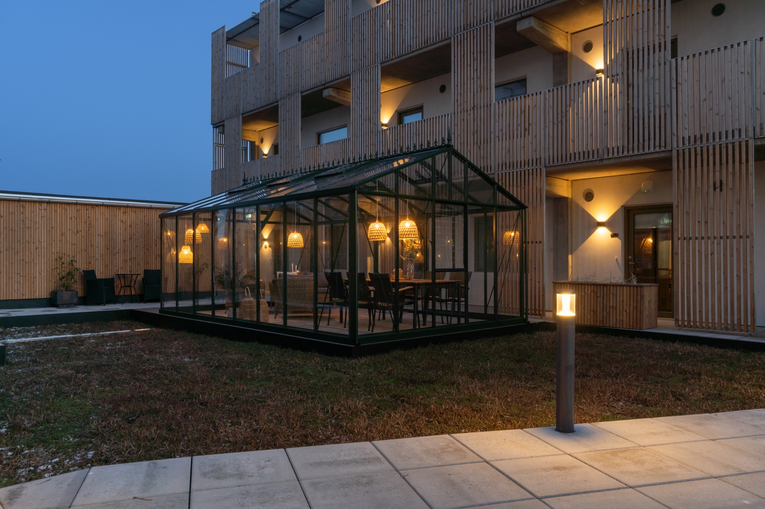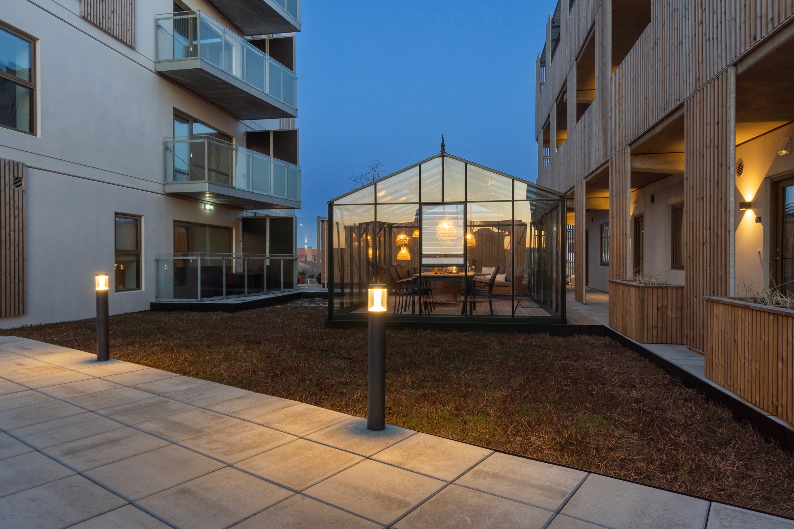 Udsigt over park og grønne gårdrum
